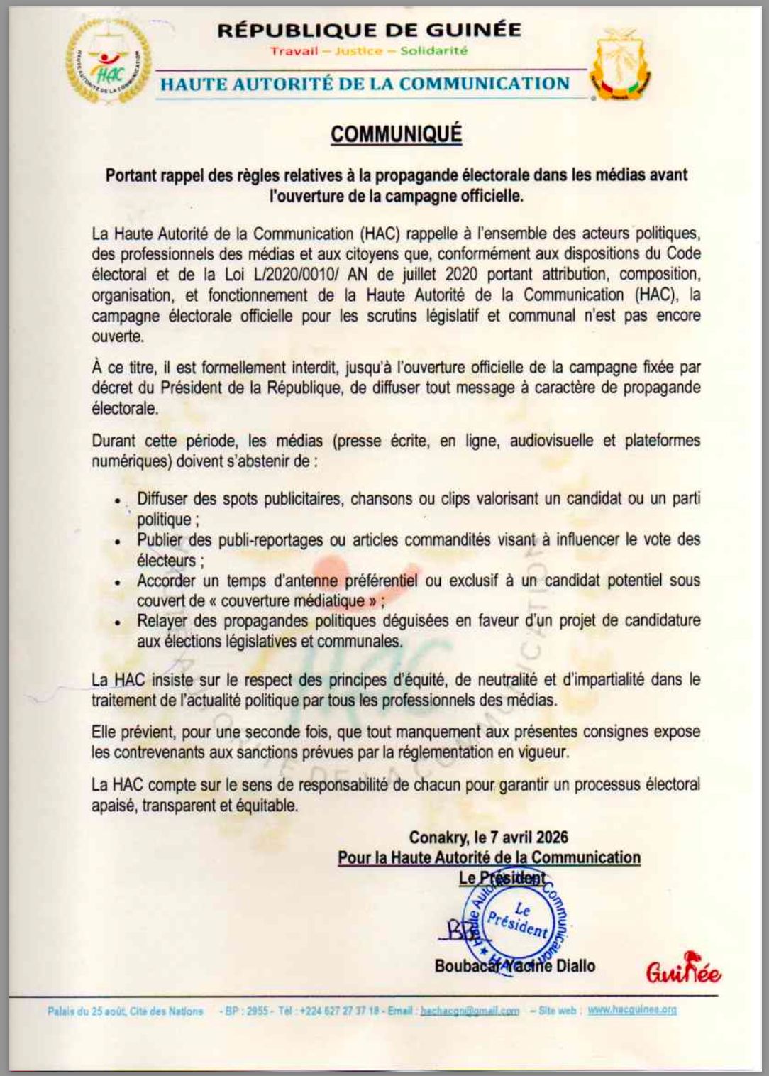 Dans un communiqué publié ce mardi 7 avril 2026 à Conakry, l’organe de régulation des médias a rappelé qu’il est formellement interdit de diffuser tout message à caractère de propagande électorale avant l’ouverture officielle de la campagne.